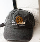 Unstructured, 6 panel baseball hat (AKA "dad hat") in pigment dyed vintage black or forest green with design embroidered on the front. Adjustable strap back with metal clasp.
