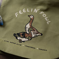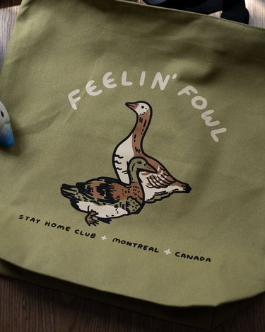 Our 'Feelin' Fowl' duck and goose are printed in 3 colours on the front of this olive green tote with black canvas straps.