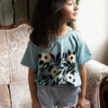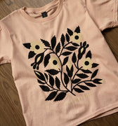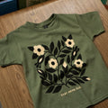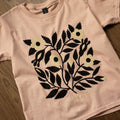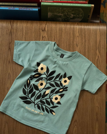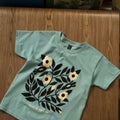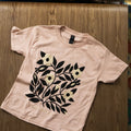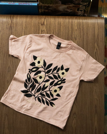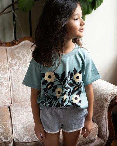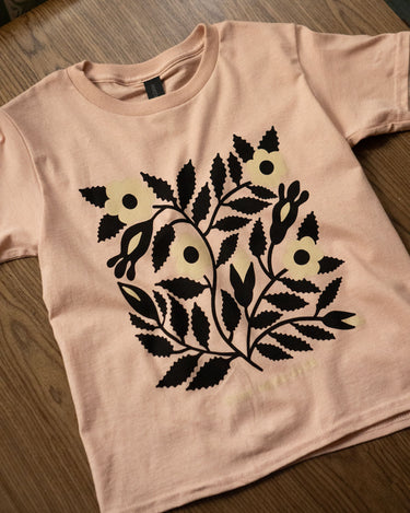 Sérigraphié en 3 couleurs d’encre à base d’eau sur un t-shirt pour enfants Gildan « heavy cotton » de couleur gris athlétique. Nous constatons que ces t-shirts taillent grand au début, mais perdent environ 2,5" de longueur et 1" de tour de poitrine après le lavage! Les mesures indiquées dans le tableau des tailles sont celles du prélavage.