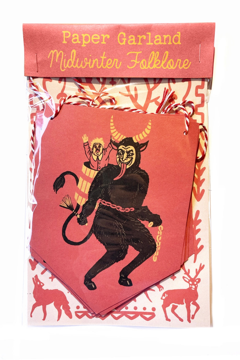Quand les nuits sont longues et que la neige recouvre la terre, nous découvrons les contes populaires de la mi-hiver. Cette guirlande en papier présente huit contes populaires illustrés du monde entier, de Krampus, Belsnickle et Jólakötturinn, à Mari Lwyd et la Chasse sauvage.