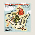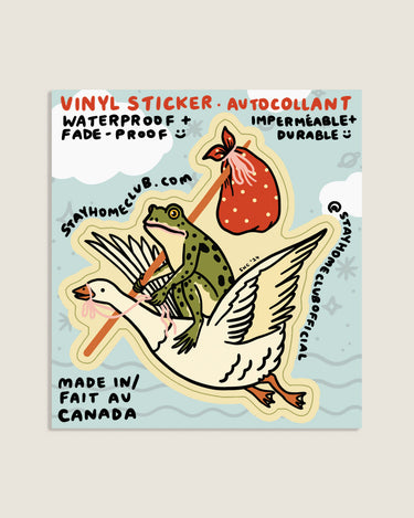 It's a frog riding a goose into the sunset, because it just is. Don't think too hard about the proportions. Everything is fine.